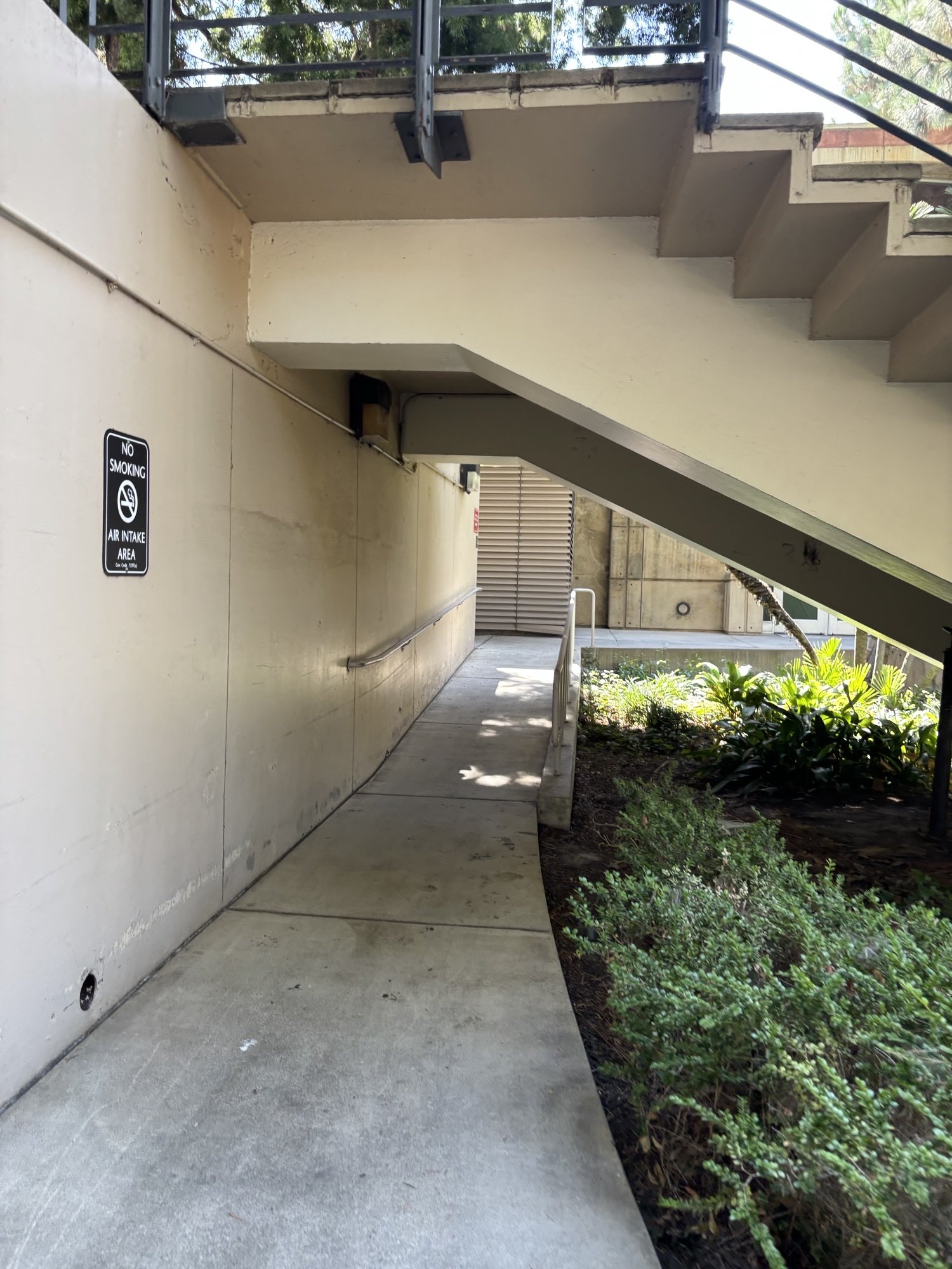 Step 4: Take the ramp marked with accessibility signage. The ramp runs alongside the building, underneath the exterior stairway.
