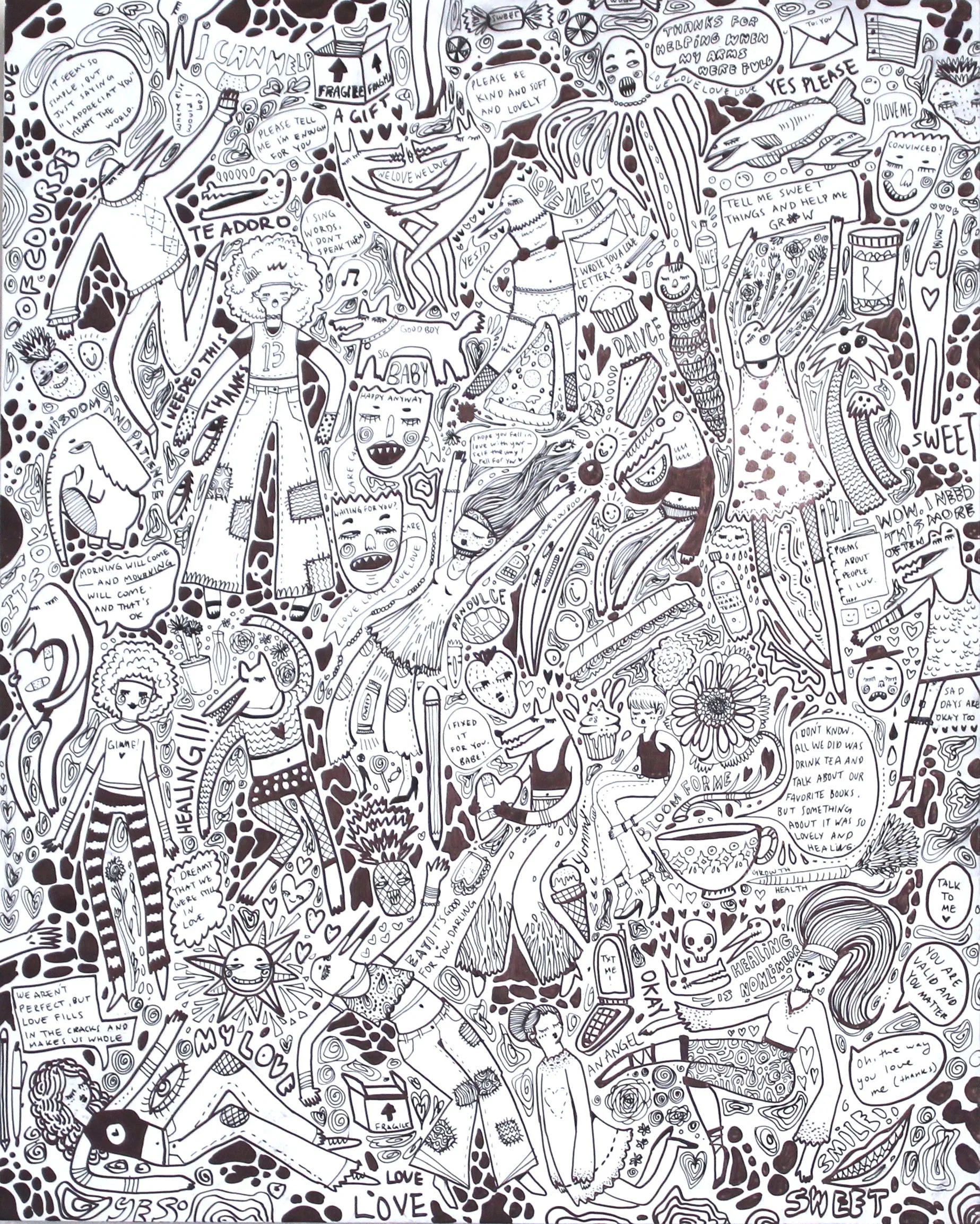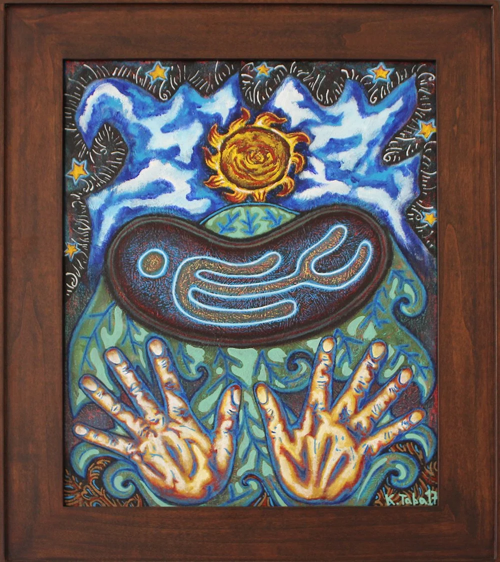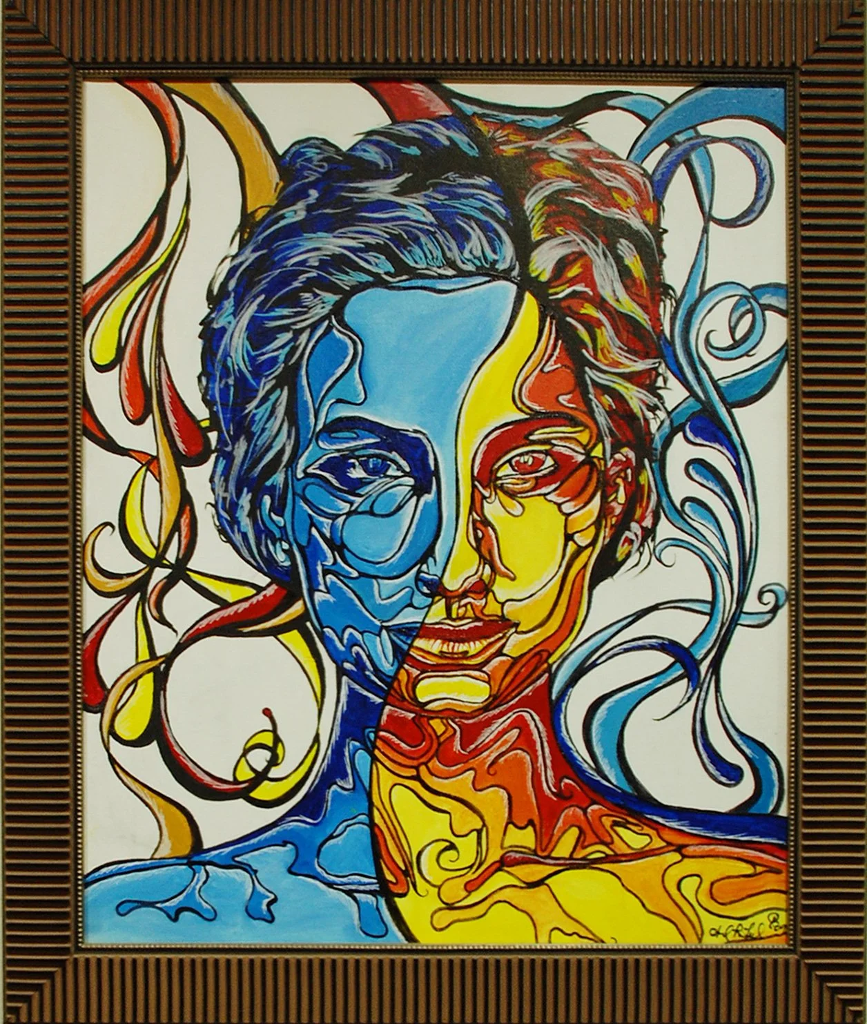 I first drew an outline for my envisioned design and carved the drawing out using a bandsaw, jigsaw, and sander to transform my wooden surface into three different shapes--the top and bottom portions of the paper and the two embracing figures. I then used wood glue to arrange the pieces into one sculptural form and prepped the surface for painting.