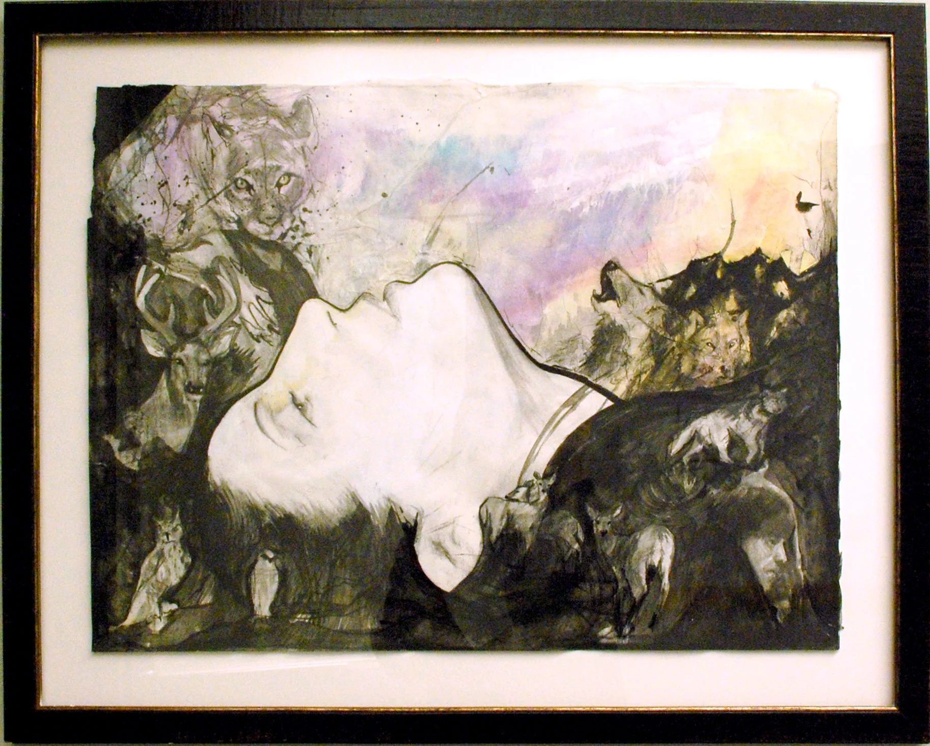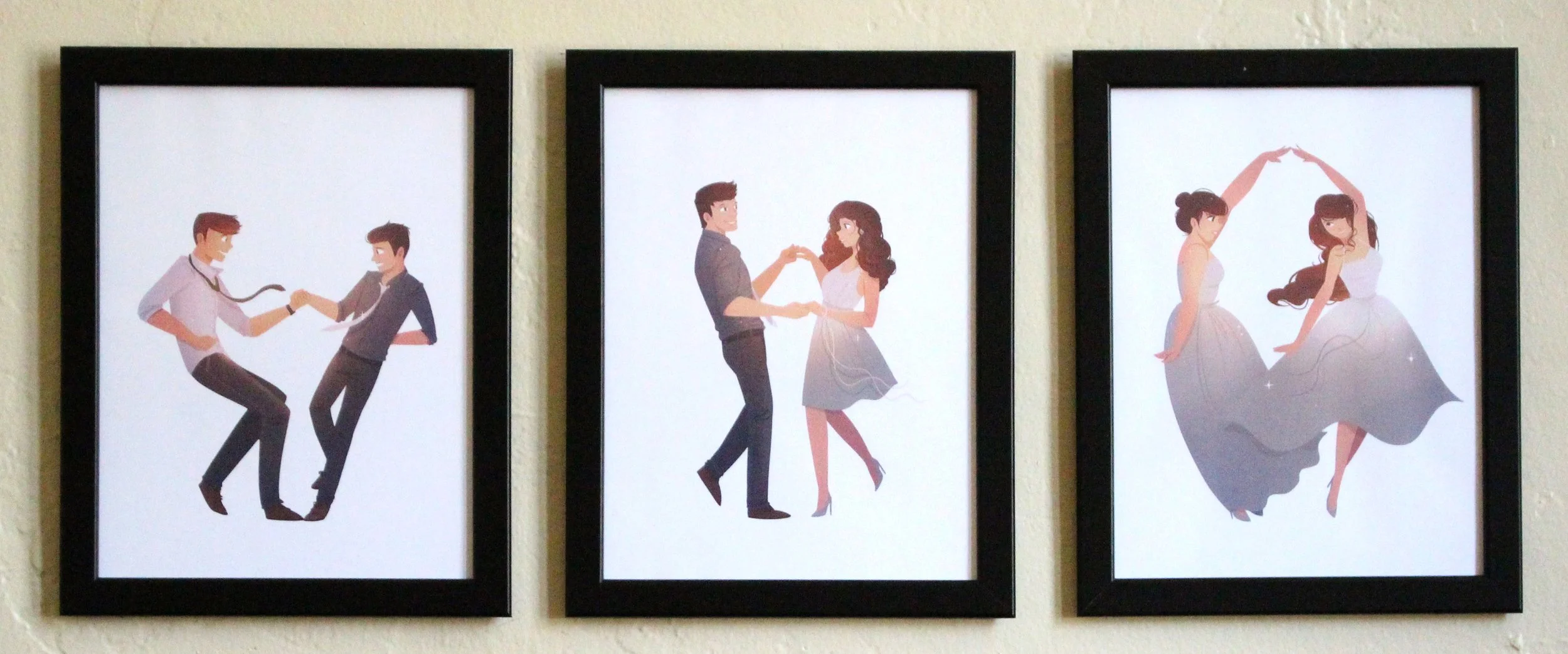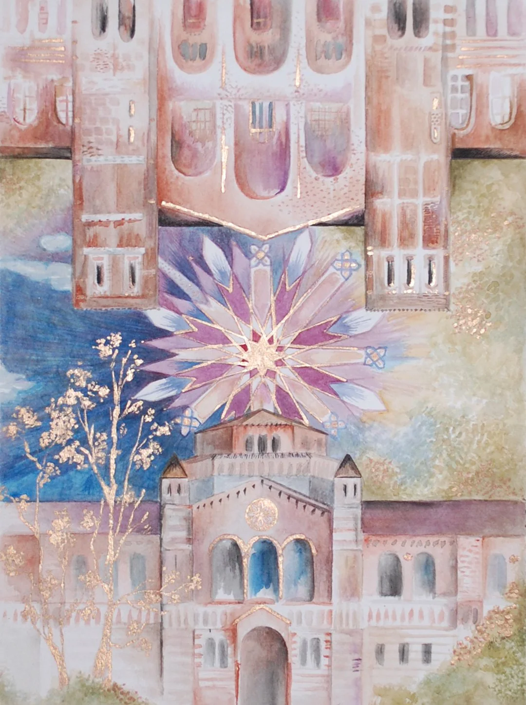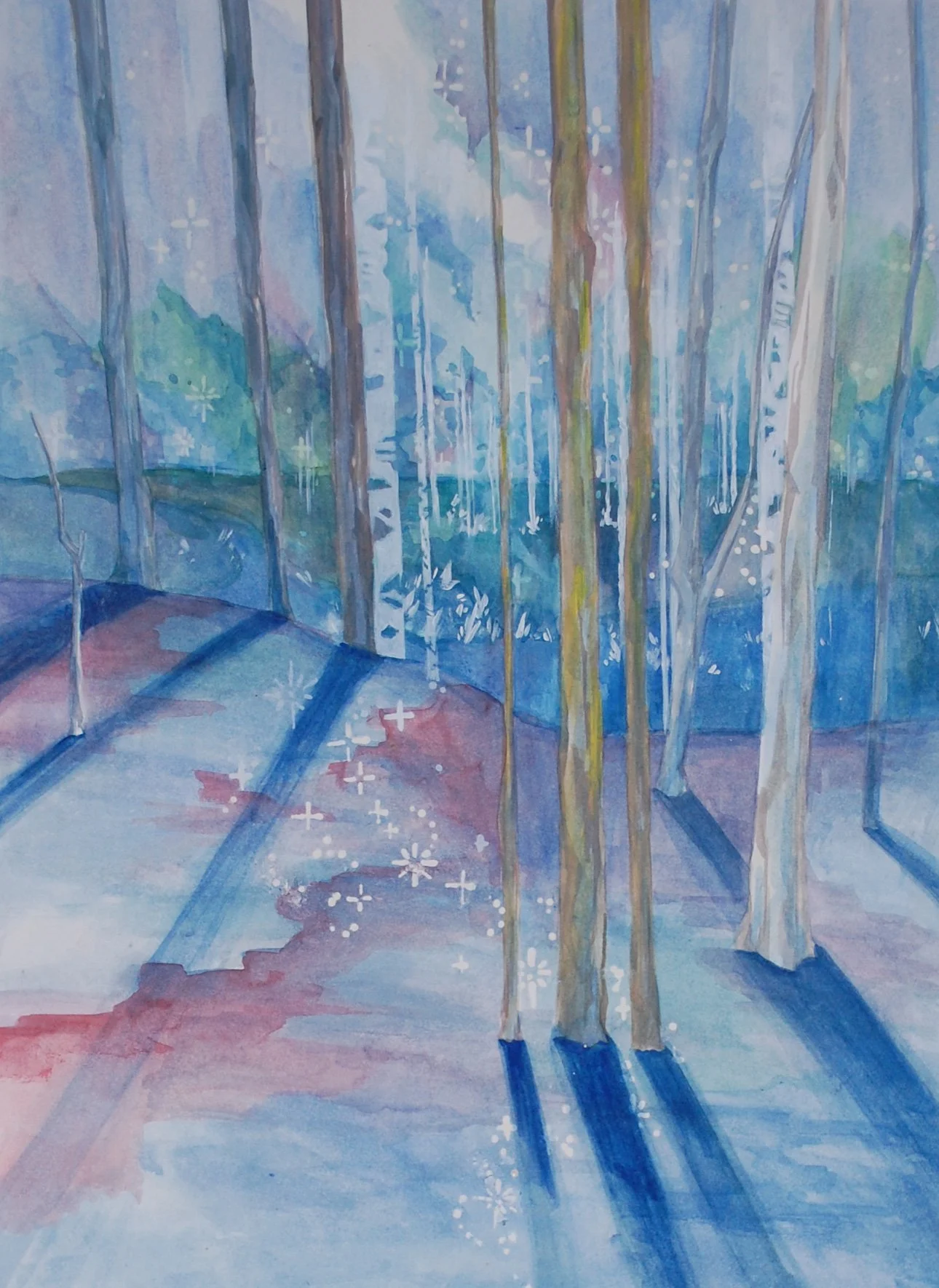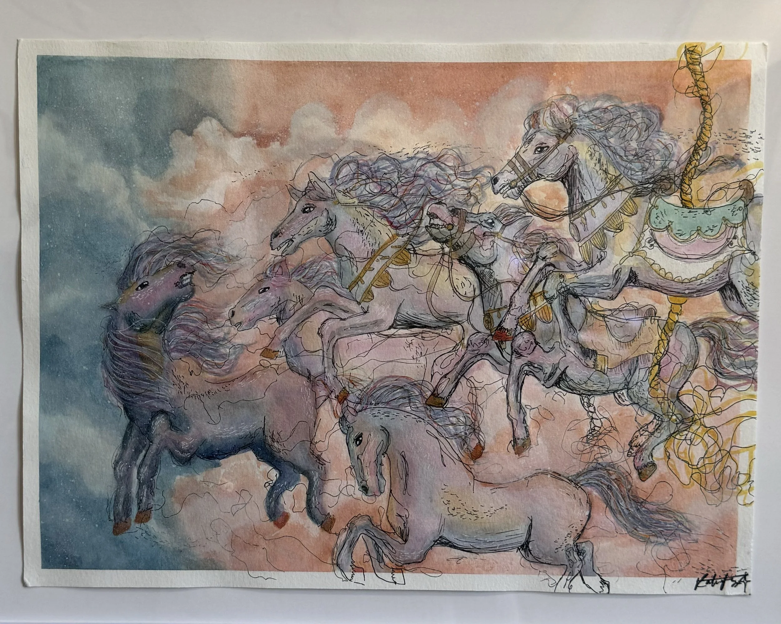 I created this painting in multiple layers, first sketching the detailed carousel horses with black ink, then bringing it to life with watercolors, and finally painting the clouds in the background. To add more texture and dimension, I illuminated the horses' accessories with a gold metallic shimmer.