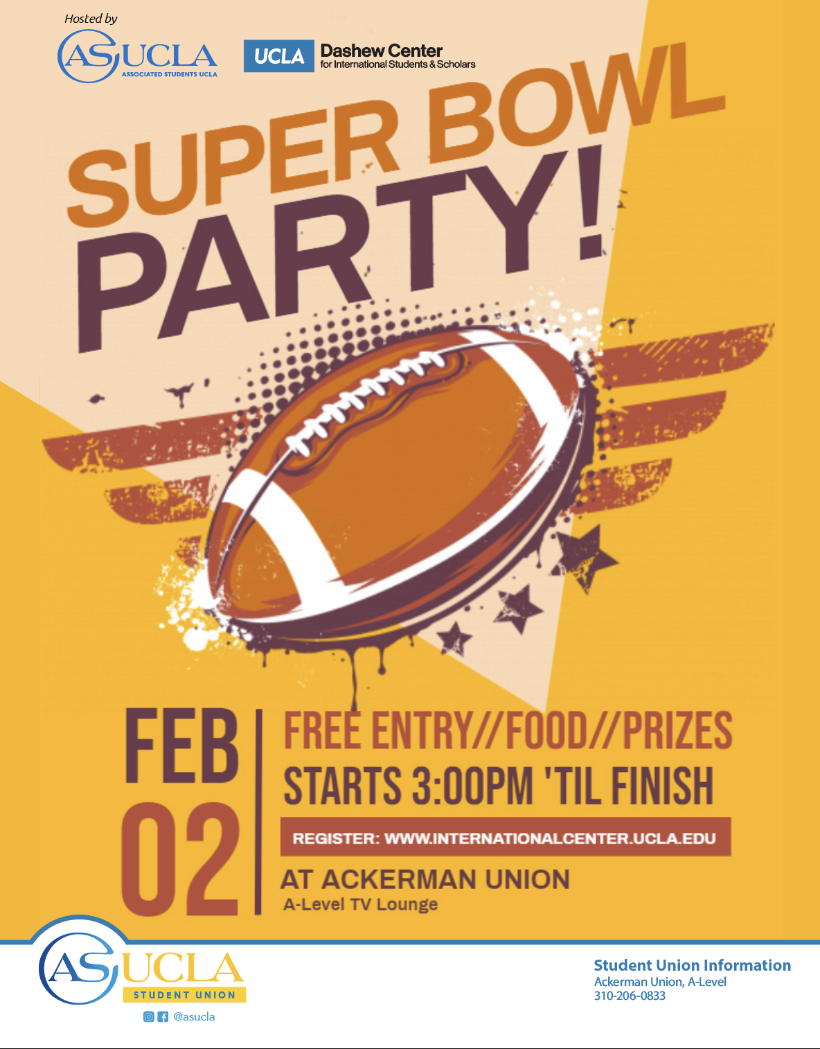 “The Super Bowl is one of those iconic sporting events that is deeply a part of American culture, and we are so proud to partner with the Dashew Center to bring this experience to our international students,” said Ari Baron, ASUCLA Director of Marketing, Sales & Promotions. “Whether you love football, are a casual fan, or have never watched before, this is a great opportunity to come out, check out the festivities and also meet and bond with other students.”