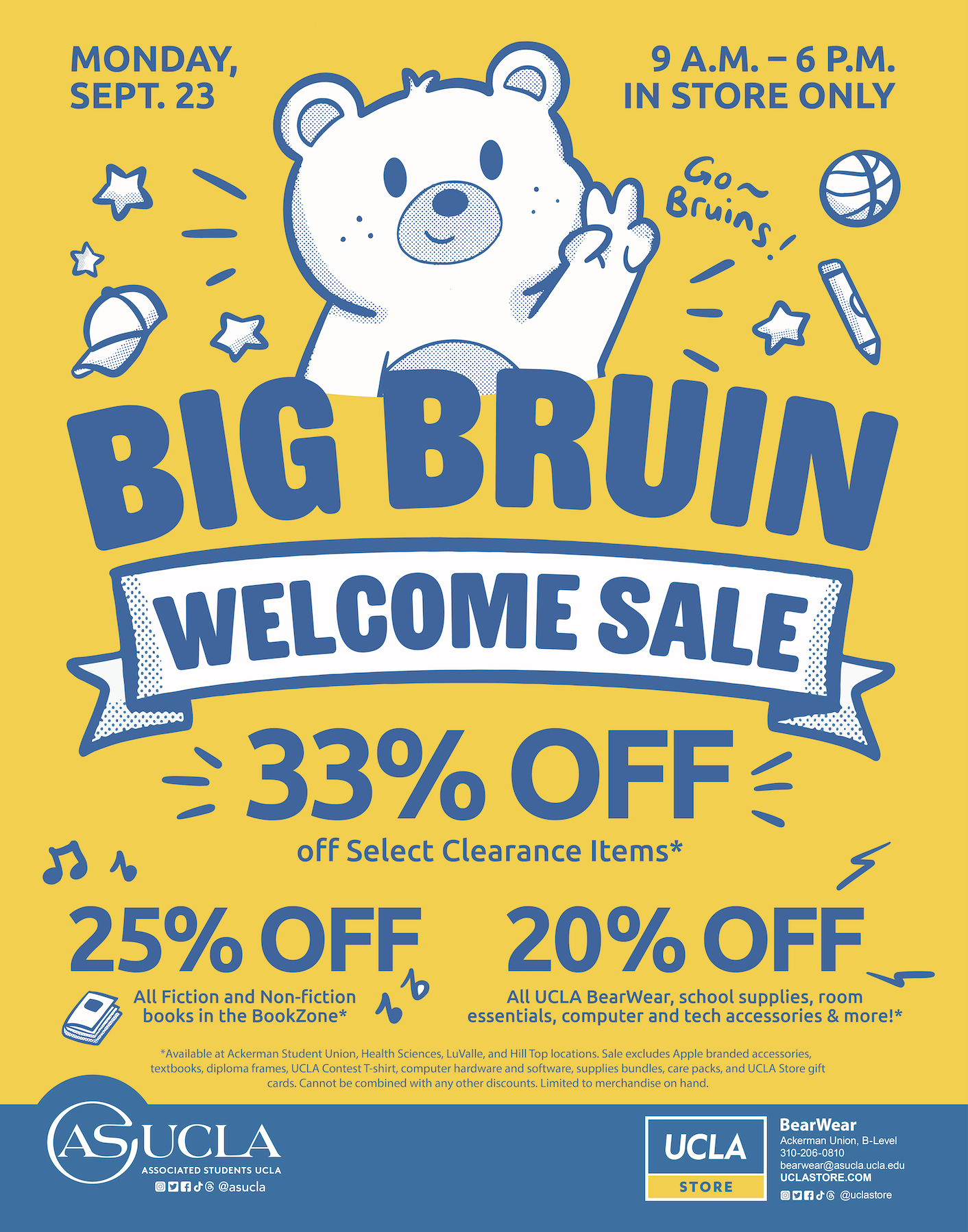 During the Big Bruin Welcome Sale, take 20% off BearWear apparel and accessories, school and office supplies, room essentials and tech accessories, with up to 33% off select clearance items. Plus, save 25% on fiction and non-fiction books throughout BookZone on A-Level of Ackerman Union. This exclusive sale will be Sept. 23 and will be available in-store only at the UCLA Store locations of Ackerman Student Union, Health Sciences Store and LuValle Commons Store.
