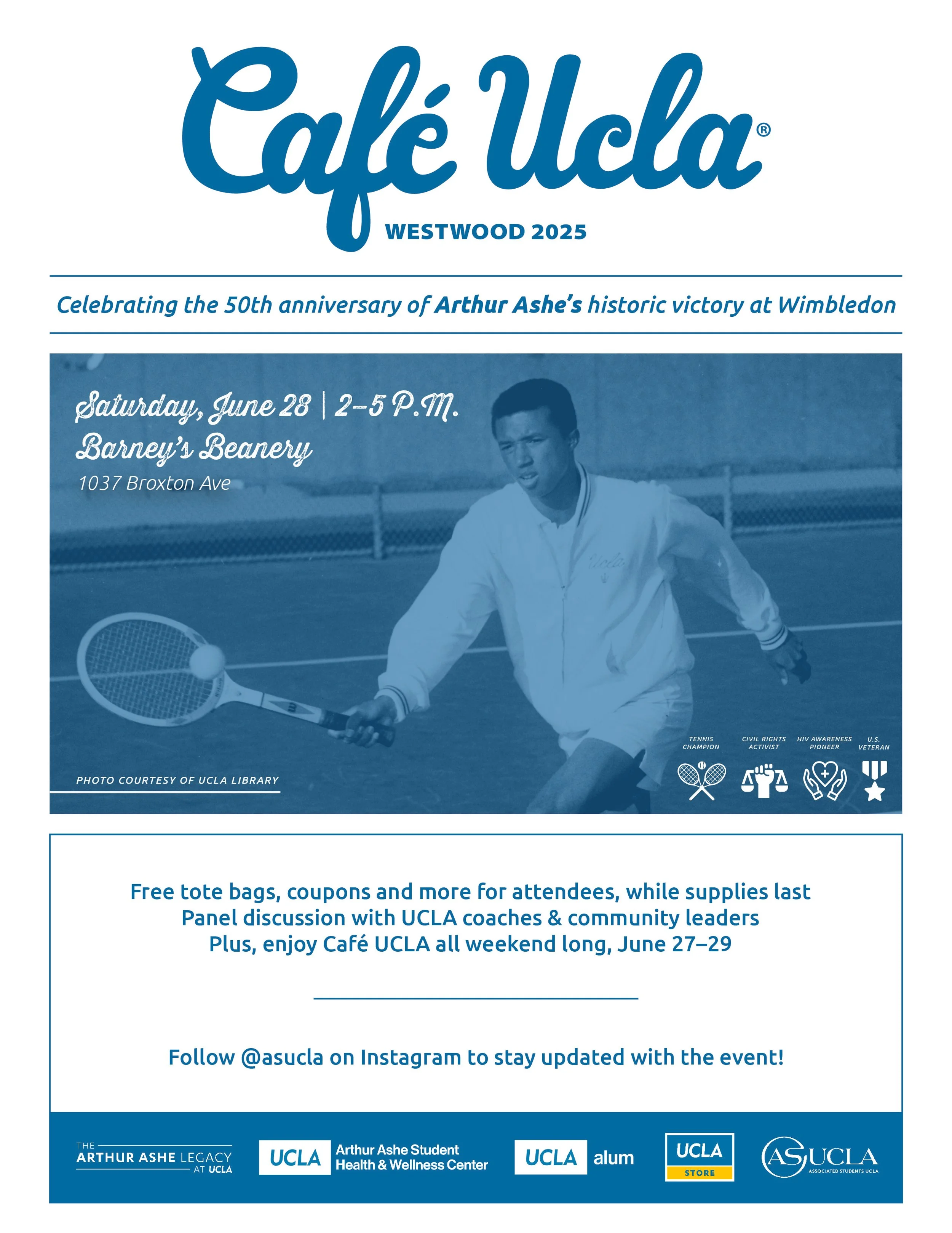 Los Angeles, Calif., June 24, 2025 – Join Bruins and fans alike to enjoy Café UCLA, a weekend Westwood take over in honor of the 50th anniversary of the Wimbledon victory and legacy of UCLA alumnus Arthur Ashe ‘66.