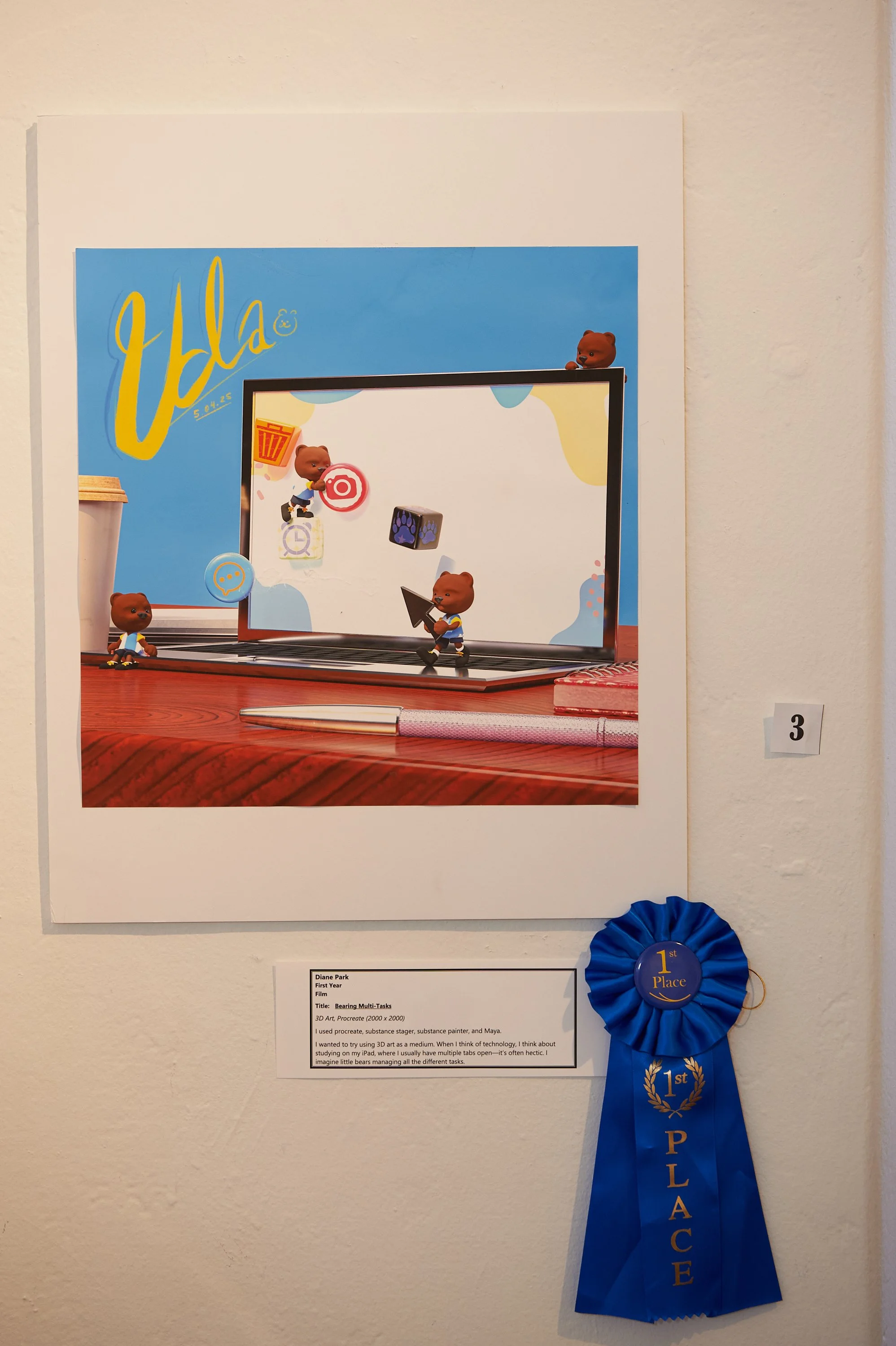 There were three winners recognized at a formal reception on May 15 from 4-6 p.m. in the Kerckhoff Art Gallery: Madeleine Tsoi second year bioengineering student, with a piece titled “Out of Storage;” Michelle Lin, first year statistic and data science student, created a piece titled “Resilience in Bloom;” and Diane Park, first year film student, made the piece “Bearing Multi-Tasks.” Winning students received $600 for their prize and their artwork hung in the historic ASUCLA Student union; Tsoi and Park will have their artwork featured in the UCLA Computer Store, a student-run enterprise of ASUCLA, as it was in alignment with the contest’s technology-inspired theme.